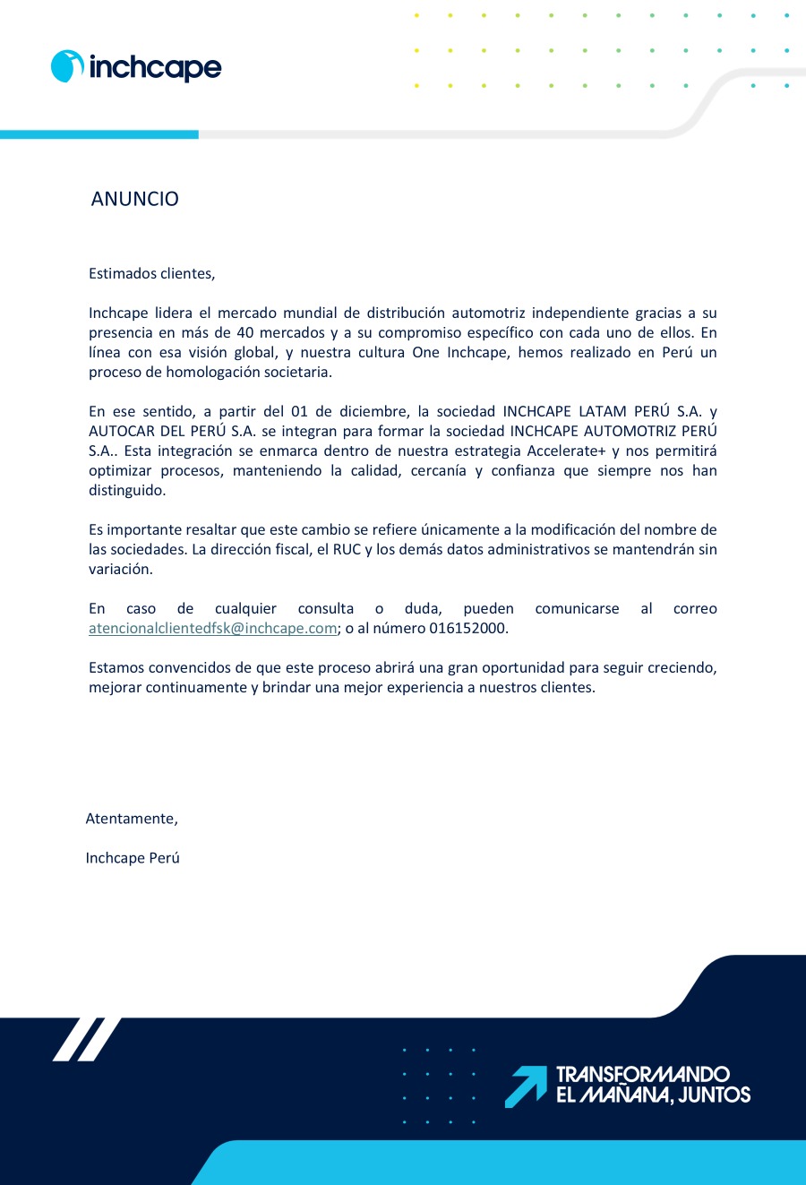 A partir del 01 de diciembre, la sociedad INCHCAPE LATAM PERÚ S.A. y AUTOCAR DEL PERÚ S.A. se integran para formar la sociedad INCHCAPE AUTOMOTRIZ PERÚ S.A.. Esta integración se enmarca dentro de nuestra estrategia Accelerate+ y nos permitirá optimizar procesos, manteniendo la calidad, cercanía y confianza que siempre nos han distinguido.
